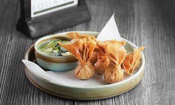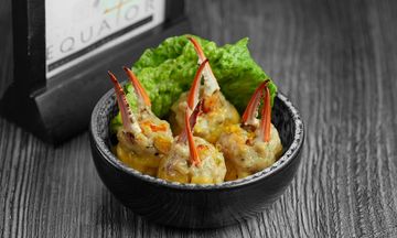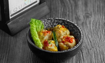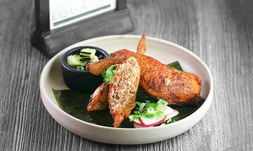Fried boneless chicken wings stuffed with pork, shrimp, glass noodle, onions, carrots