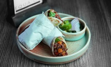 Ground beef, potatoes, onions and cilantro wrapped in paratha served with Thai Ajaad (pickled cucumber, red onion & pepper relish) <light spicy>
