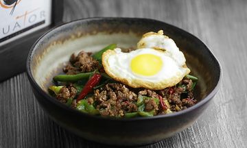 Stir fry green beans, jalapeno, garlic & basil with street food style chopped and seasoned protein of your choice, topped with fry egg <very spicy>