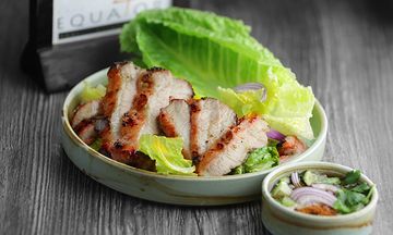 Grilled chef's special cut well-marbled pork collar, with northeastern style chili-lime relish (red onion, green onion, cilantro, toasted rice and mint leaf), served over fresh romaine <medium spicy>