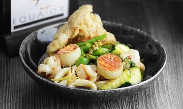 Sauteed spicy assorted seafood (shrimp, scallop, calamari) with zucchini, green beans, bell pepper and sweet basil, topped with crispy thin sliced fried catfish <medium spicy>