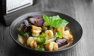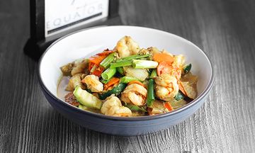 Eggplant, bell peppers & onions in rich roasted chili sauce with seafood of your choice <light spicy>