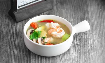 (12 oz cup) Non sweet, light and lean - sour and spicy lemongrass shrimp soup with fresh mushrooms, tomatoes, shallot, cilantro, flavored with a splash of lime juice and chilis <medium spicy>