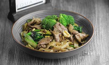 Flat noodles sauteed with oriental kale (kailan), broccoli, egg in garlicky see-ew sweet soy base sauce <mild>