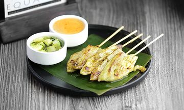 Skewers of marinated chicken tenders served with cucumber sauce and peanut sauce