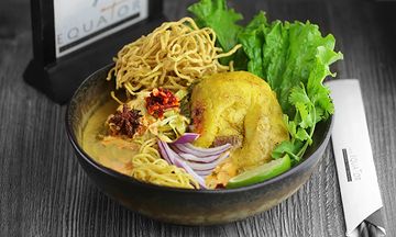 A coconut curry egg noodle soup, red onion, cilantro, oriental cabbage (bok choy) and pickled mustard greens with our signature curry braised split chicken breast < light spicy>