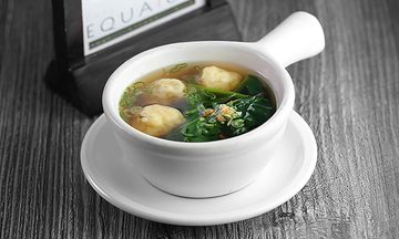 Shrimp wonton, spinach, sprinkles of scallions in light and clear broth <mild>