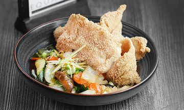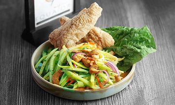 Young green mango, onion, cashew, mint, cilantro in a spicy sweet and sour dressing served with crispy thin-cut fried catfish <light spicy>