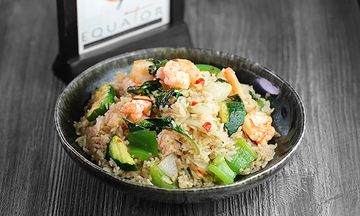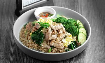 (contains egg and fish sauce) Sauteed jasmine rice with egg, leafy oriental broccoli (Kailan), broccoli, carrots, zucchini, sprinkle of ground white pepper, green onions and cilantro served with traditional Thai chili fish sauce <light spicy>