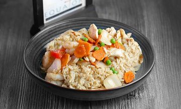 Sauteed jasmine rice with chicken breast and shrimp, yellow onions, tomatoes, carrots and peas <mild>