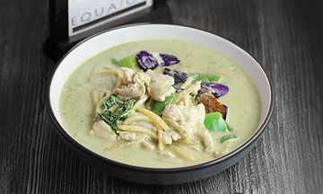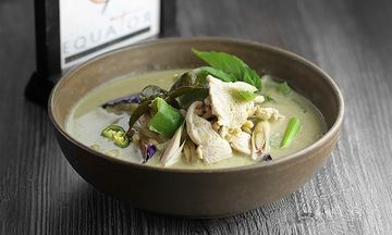 Authentic street food version, more soupy, less creamy, bold and more flavor-intense herbs curry, eggplant, bell pepper, jalapeno, bamboo shoots and basil <medium spicy>>