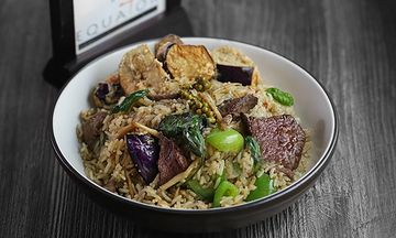 Sauteed (non coconut based) green curry spiced jasmine rice with bamboo shoots, jalapeno, basil served with fried eggplant <medium spicy>