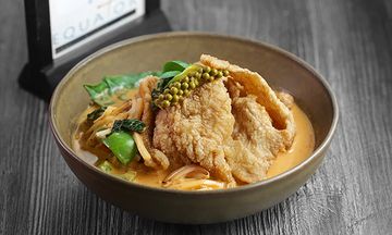 Creamy red curry, carrots, bamboo shoots, young pepper corn, thai basil & crispy thin sliced fried catfish <medium spicy>