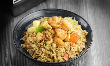 Sauteed lighly spiced jasmine rice with shrimp, pineapple, carrots, onions and cashew nut <light spicy>