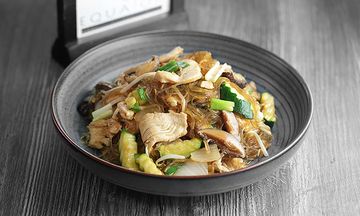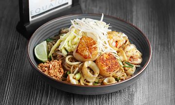 Rice noodles sautéed with shrimp, calamari, scallops , green onions and egg in a sweet & sour tamarind served with sprouts and crushed peanuts (choose your spicy level, otherwise served mild)