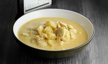 A yellow coconut curry sauce with potatoes and onions <light spicy>