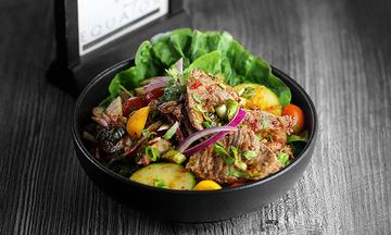 Slices of beef with red onions, tomatoes, cucumber, cilantro and mint leaf (depends on availability) in a zippy lime juice-based dressing served over fresh romaine <medium spicy>
