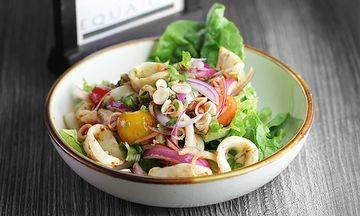 Blanched squid rings flavored with finely chopped lemongrass, red onions, tomatoes, cilantro and mint leaf (depends on availability) in spicy lime juice dressing served over fresh romaine <medium spicy>