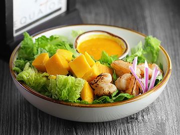 Sliced ripe mango, grilled shrimp, red onion, romaine lettuce served with ginger mango dressing < mild >